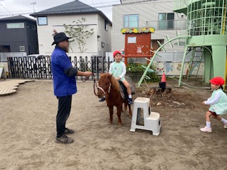 年長さんは特別!!ポニーのチョコちゃんの背中に。