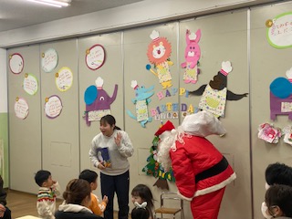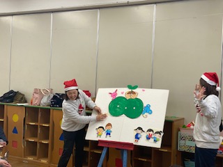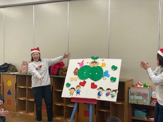 先生たちとクリスマスのリースに飾りを付けたり絵本を見たりしていると…